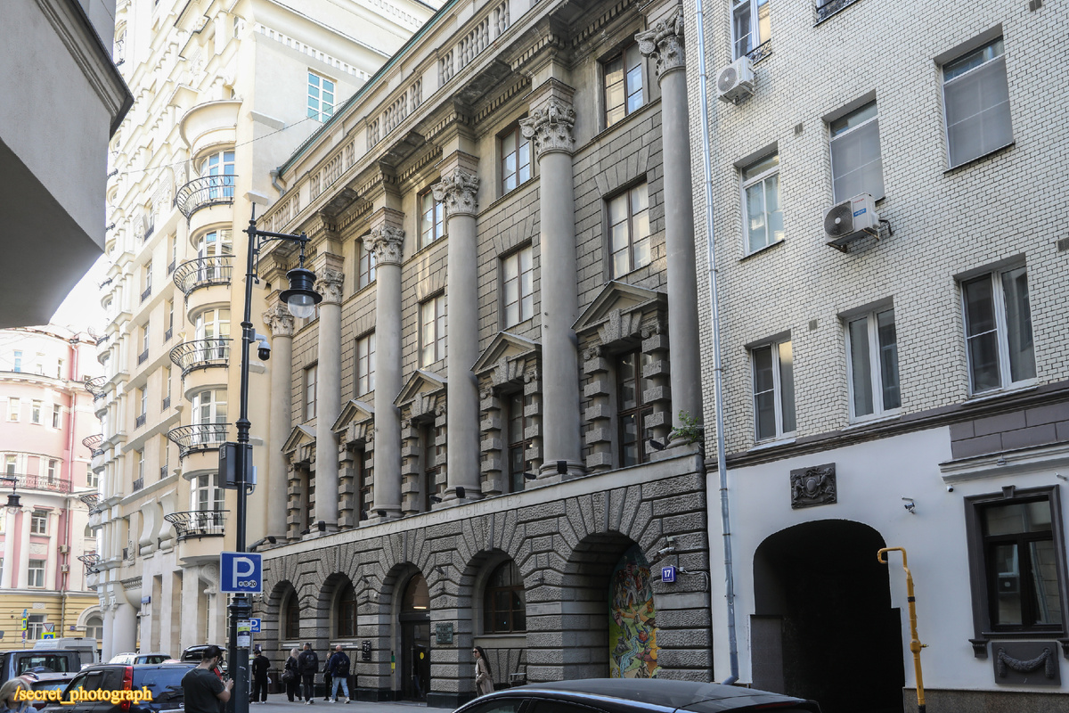 В Ермолаевском переулке, в паре шагов от Патриаршего пруда, стоит монументальный пятиэтажный дом. В стиле неоклассицизма с явными признаками итальянского ренессанса, почти целиком облицованный под крупный руст, с шестью гигантскими коринфскими полуколоннами. А на белоснежном пояске над окнами первого этажа с замковыми камнями тянется надпись: «Московское архитектурное общество». Об этом обществе я упоминал в своих заметках уже неоднократно. Оно было основано в 1867 году по инициативе Михаила Доримедонтовича Быковского, а членами его стало множество как собственно архитекторов, так и инженеров-строителей. В разные годы его председателями являлись сам Михаил Быковский, его сын Константин Михайлович, Александр Степанович Никитин, Петр Сантинович Кампиони, Максим Карлович Геппенер, Федор Осипович Шехтель, Алексей Викторович Щусев и другие прославленные мастера. Очень интересно то, что совсем рядом с этим домом, на Спиридоновке, стоит еще один, о котором я писал больше двух лет назад – особ