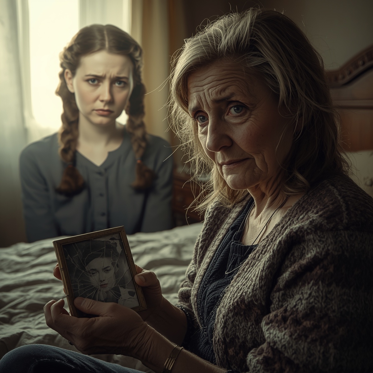 Обошла комнату, заглянула даже на кухню. Никого. Вернулась обратно, стала поправлять подушку, и тут нащупала под ней что-то твёрдое. Подняла подушку, а там фотография. Старая, в потрескавшейся рамке. Девушка молодая на ней, лет двадцати, с косами длинными. Глаза грустные такие. Позади дом деревянный с наличниками резными.