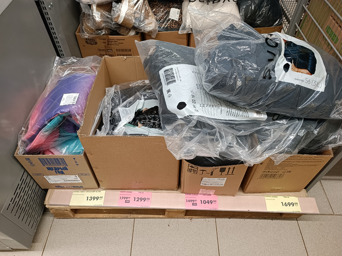 Начну с паллета, на котором стоят коробки с товарами, которые были новинками до сегодняшнего дня. Акция по распродаже уже началась, куртки посмотрите, уже продаются с дисконтом.