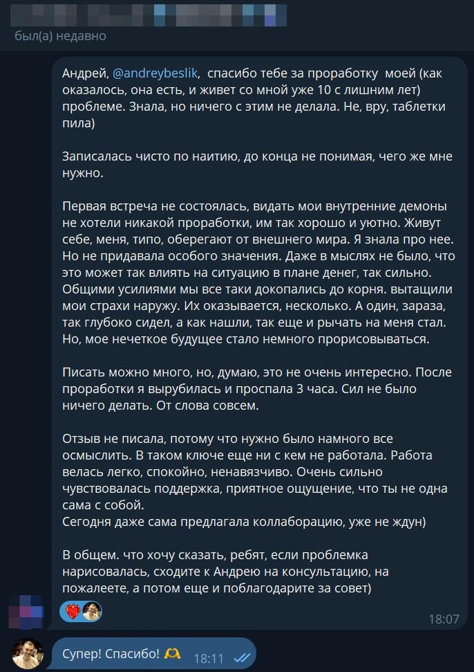 Ты можешь жить с такими проблемами годами и вообще их не замечать. Ты забываешь, что это вообще проблема. Она пришла на встречу с обычным в моей работе вопросом: «Как мне зарабатывать больше?». А свою проблему она носила в себе десять лет и не знала, что это мешает её благополучию. Внешне это было похоже на отсутствие мотивации или «предназначения». Но на вопросы по поводу будущего вместо ответов было молчание. Потом она сказала, что вообще не знает, куда ей хочется идти. Человек может очень хотеть заработать. Но если его представление о будущем заблокировано, если он не видит, куда идти, действовать он не будет. Зато будет создавать видимость бурной деятельности. Будет ходить кругами. А целевых денежных действий так и не сделает. Мы просто убирали завалы на подходе к ней. Там не было никакого волшебства. Просто работа. Иногда это важно. Чтобы работа была осторожной, системной. Когда человек носит проблему десять лет, она становится настолько прочной, что ее нельзя просто так взять и в