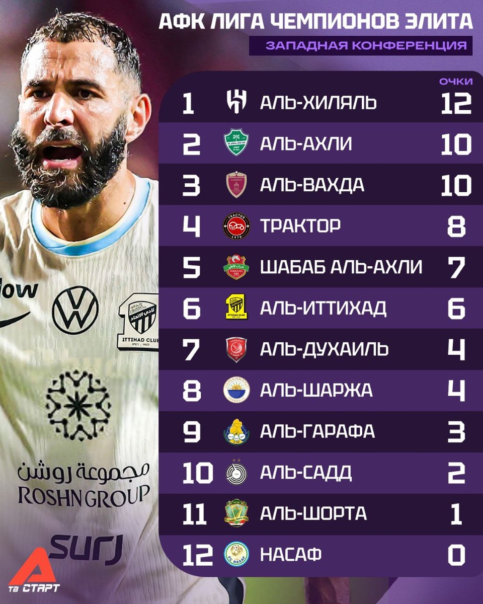 🔎📜 Четвёртый тур АФК Лига Чемпионов Элита прошел без сенсаций На Западе саудовские гранды спокойно победили своих соперников, а «Шабаб Аль-Ахли» без Азмуна разгромно проиграл в Катаре. На Востоке выделяется вторая подряд победа «Мельбурн Сити» благодаря голу в добавленное время. В целом все плотно, только «Виссел Кобе» ушёл в небольшой отрыв. «Шанхай Шеньхуа» Леонида Слуцкого немного отстаёт от зоны плей-офф. Смотрите главный клубный футбольный турнир азиатского континента эксклюзивно на телеканалах «Старт» и платформе TVSTART.RU 🖥 Подписывайся на ТВ СТАРТ в MAX📲