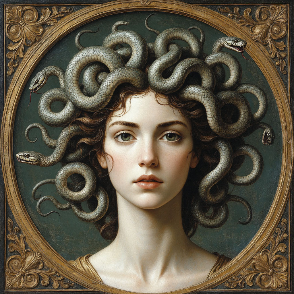- Змеи вместо волос — символ амбивалентный. С одной стороны, это мудрость и возрождение (змея сбрасывает кожу). С другой — хаос, опасность и «змеиная» природа соблазна.
