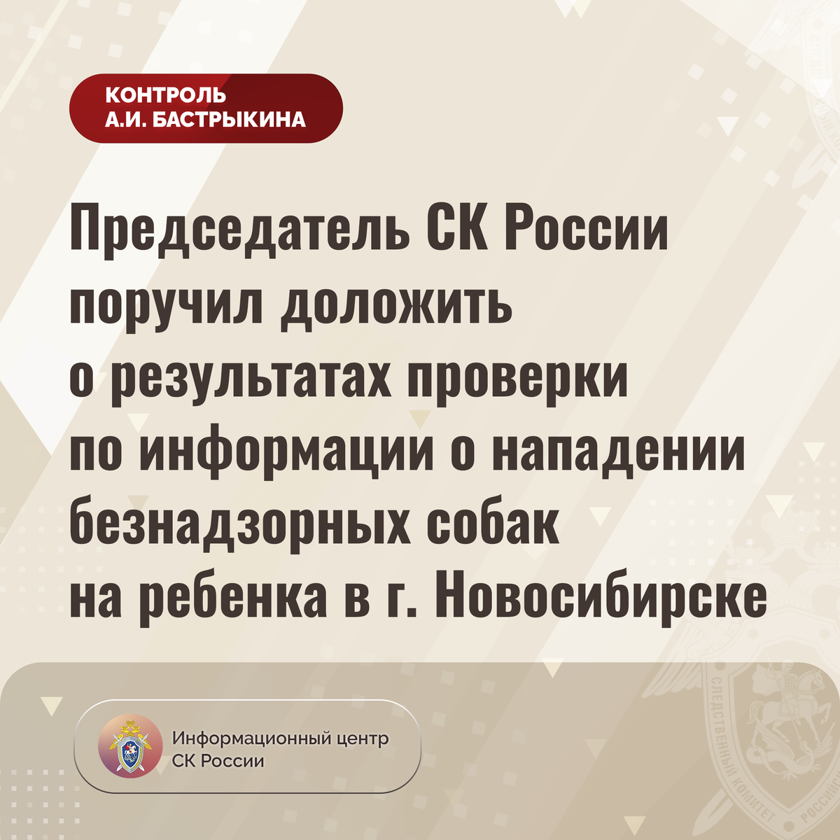 Председатель СК России поручил доложить о результатах проверки по информации о нападении безнадзорных собак на ребенка в г. Новосибирске