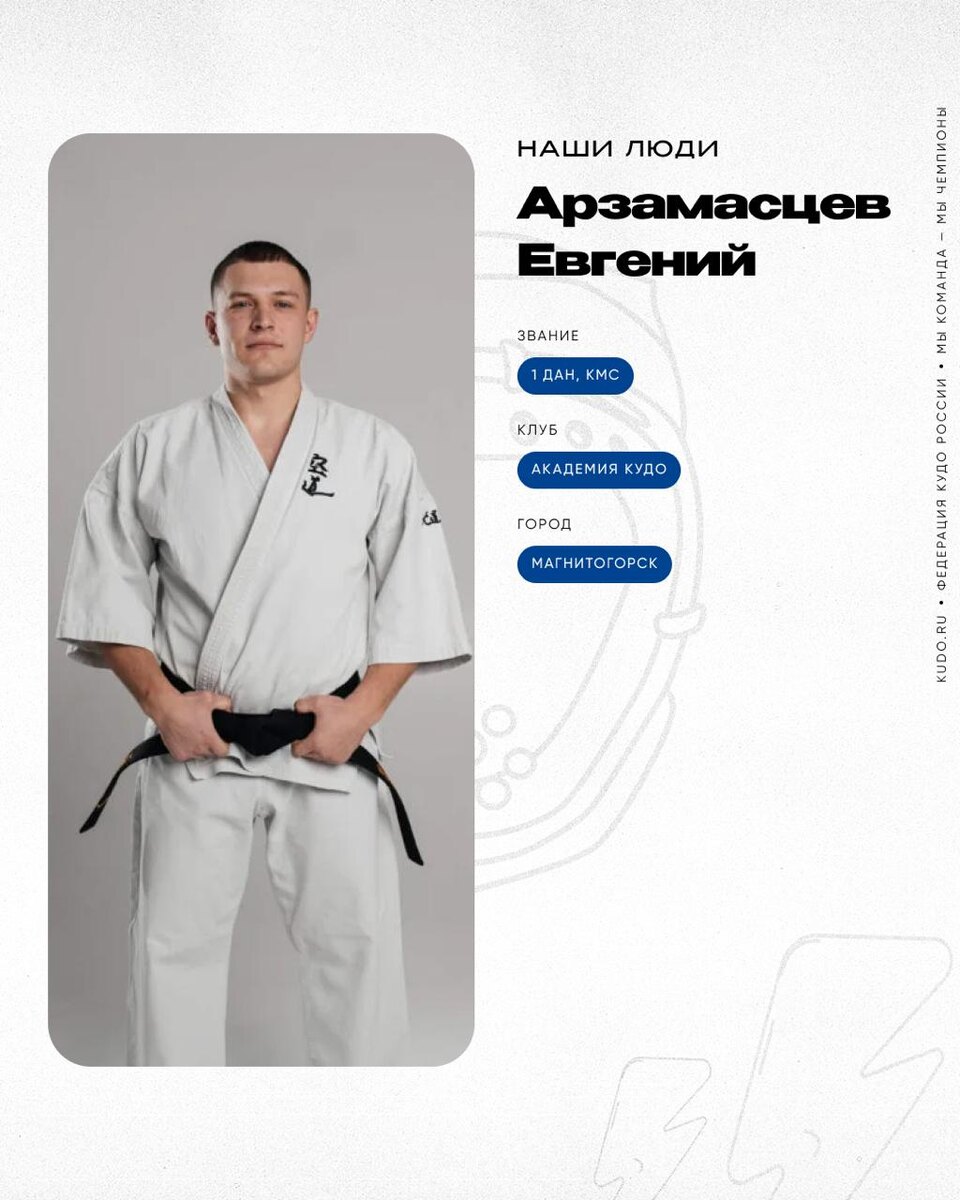 #НашиЛюди ⠀ 🥋 Арзамасцев Евгений — 1 дан, КМС ⠀ Талантливый спортсмен, которого подпитывает неугасающий интерес к единоборствам. Совмещает тренерскую работу с выступлениями на соревнованиях. Уверен, что многогранность и хладнокровие — его ключ к победам. ⠀ ⛩ Спортивный клуб — Академия кудо 📍 Город проживания — г. Магнитогорск ⠀ Евгений Арзамасцев пришёл в кудо, когда ему было всего 7 лет. Спортсмен рассказывает, что попал на первую тренировку после того, как его отец увидел на городской улице баннер «Кудо — реальнее только жизнь». ⠀ «Самым сложным в начале занятий было совмещать учёбу и тренировки», — вспоминает Евгений. ⠀ 👉 Читайте продолжение интервью на нашем сайте — https://kudo.ru/people/arzamasczev-evgenij-2/