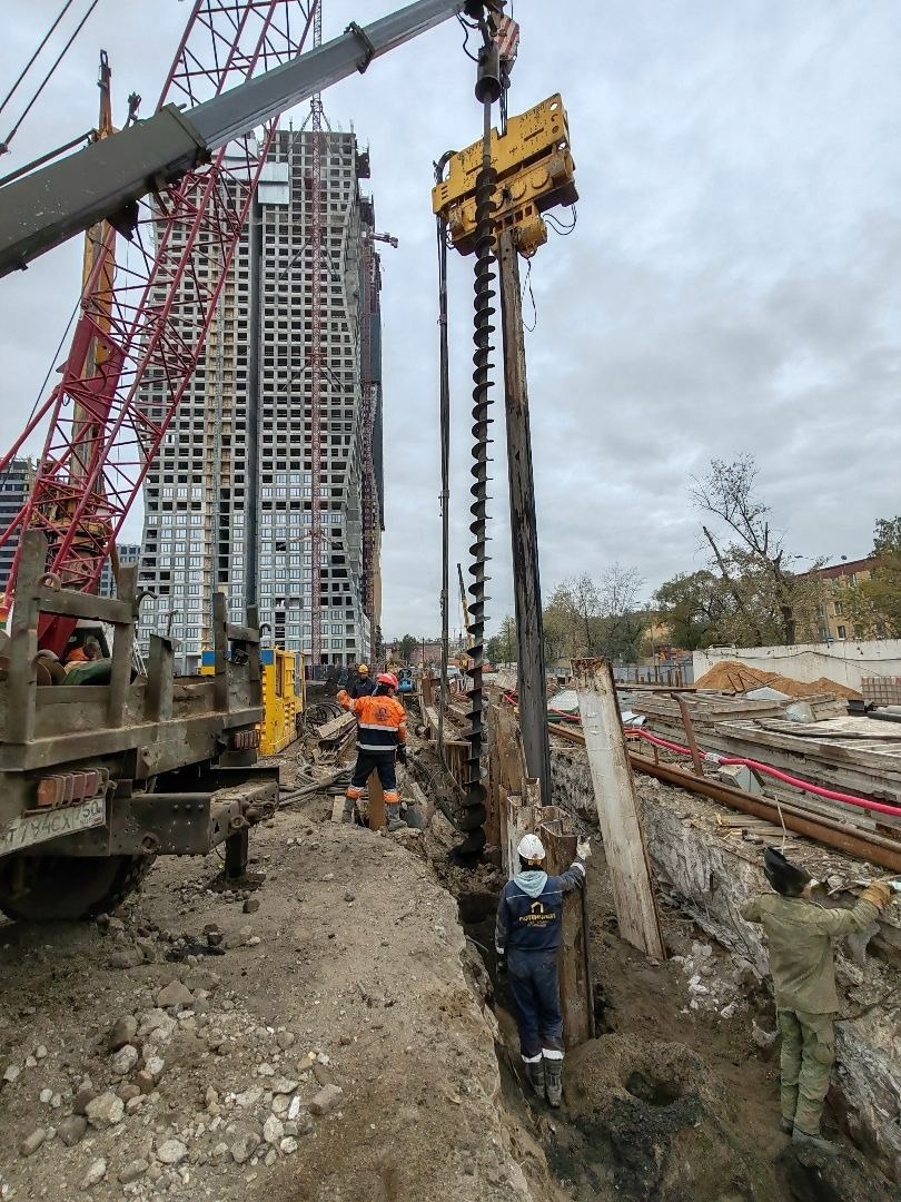 В условиях плотной городской застройки проведение шпунтовых работ часто осложняется ограниченным пространством и жёсткими требованиями по уровню шума и вибраций. Применение установки Giken ECO 700S позволяет выполнять монтаж шпунта Ларсена в таких условиях с соблюдением технических и экологических норм, обеспечивая высокую точность и безопасность работ. Giken ECO 700S — это компактная гидравлическая установка, работающая по технологии статического вдавливания. В отличие от вибропогружения, метод основан на передаче давления через гидравлические цилиндры, без ударного и вибрационного воздействия на грунт. Реактивное усилие создаётся за счёт уже установленных шпунтов, что позволяет погружать последующие элементы с высокой точностью и без дополнительного оборудования. Одним из ключевых преимуществ Giken ECO 700S является способность работать на площадках с ограниченным пространством. Установка имеет систему самопередвижения и перемещается по линии уже установленных шпунтов. Это исключает
