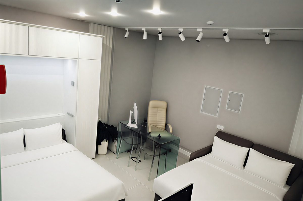 ◽ Спальные места: двуспальная кровать с итальянским матрасом, сенсорная подсветка, USB-разъёмы и розетки 220 В, зеркало в шкафу кровати, двуспальный диван ◽ Для кого: 2 гостя (раздельные места) ◽ Площадь: 28–29 кв. м ◽ Интернет: быстрый Wi-Fi ◽ Кухня с элитной встроенной техникой: посудомоечная машина, холодильник, кофеварка и чайник, вся необходимая и сервировочная посуда, штопор, духовой шкаф с свч, диффузор с моющим средством для посуды, одноразовые губки и салфетки. ◽ Удобства: средства гигиены, халаты, тапочки, полотенца премиум-класса ◽ Техника для комфорта: стиральная - сушильная машина, пылесос, утюг, парогенератор ручной, фен, диффузор с жидким мылом, водонагреватель, пк с большим монитором и встроенным звуком, клавиатура и мышь беспроводные. Андроид ТВ с большой диагональю, голосовым управление, с Ambilight-подсветкой. ◽ Системы: умное освещение и климат-контроль, теплый пол в зоне входа ◽ Вход: отдельный, с дистанционным доступом 24/7, бесключевой, бесконтактно ◽ Развлечения