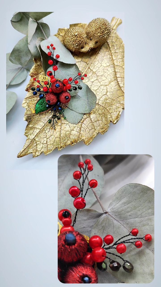 Яркий акцент в виде вашей новой броши "БРУСНИКА" украсит любое пальто базового оттенка, смягчит образ в стиле casual, внесет сочную нотку в