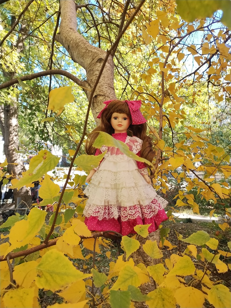 Всем доброго дня! Я очень люблю свою березку. Это дерево я посадила сама много лет назад, тоненький росточек. А теперь это высокая стройная красавица. Это необыкновенно красивое дерево - в любую пору года. Я любуюсь своей березкой весной, когда она распускает свои ярко-зеленые нежные листочки и опускает бархатные сережки. Я наслаждаюсь ее желтой яркой листвой осенью, особенно на фоне бездонного голубого неба. А сегодня я решила сделать фотографии на фоне своей березки с красивой куколкой. Это фарфоровая милая девочка, именно девочка - а не барышня, которых я чаще всего снимаю. Я назвала ее Аннушка, - и образ ее для меня как русская купеческая дочь. Только посмотрите на ее наряд - и вы со мной согласитесь. Солнечный ясный день, желтые трепещущие на ветру листочки - и красивая куколка в нарядном платье. Просто момент чистого позитива. Которым я с радостью делюсь с вами, дорогие подписчки и гости блога. Фото на летнем кресле Мне очень нравится эта куколка. Ситцевое малиновое платье в г