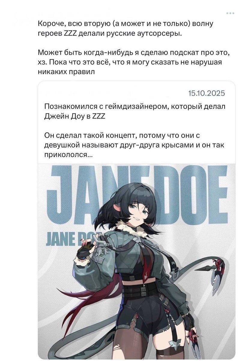Выяснилось, что над героями Zenless Zone Zero работали… российские разработчики. Они занимались разработкой всей второй волны героев для игры, а может даже больше. Это рассказал блоггер, который знаком с геймдизайнером, разрабатывавшим Джейн Доу. CtrlAltDelights- подписаться