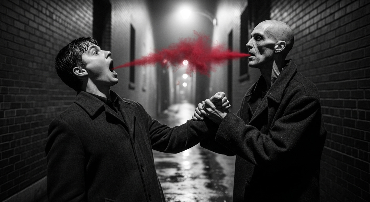 Он заметил меня. Луч фонаря поймал его лицо, пустые глаза впились в мои. Голос оборвался резко, и переулок рухнул в оглушительную тишину. Девушка моргнула, будто проснулась, и в её взгляде впервые мелькнул настоящий страх.