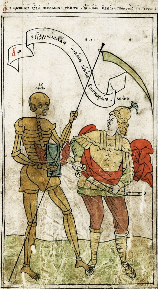Прение Живота со Смертью. Изображения XVII-XIX вв. "Прение (изначально "Двоесловие") Живота со Смертью" изначально переводное произведение. Оригинал его был переведен с немецкого языка в Новгороде в конце XV века. В форме диалога рассказывается о встрече воина со смертью, страшной видом, "как рыкающий лев". Воин бахвалится своей силой, однако Смерть, которая забрала уже Самсона, Александра Македонского и пророка Давида, одолевает и его. Произведение получило огромное распространение и постоянно перерабатывалось. В XVII веке появляются иконы с изображением сюжета и десятки миниатюр Сборников и Синодиков. На закате русского Средневековья Живот (Жизнь) соединился с образом Аники Воина, изображения которого мы встречаем на лубках.