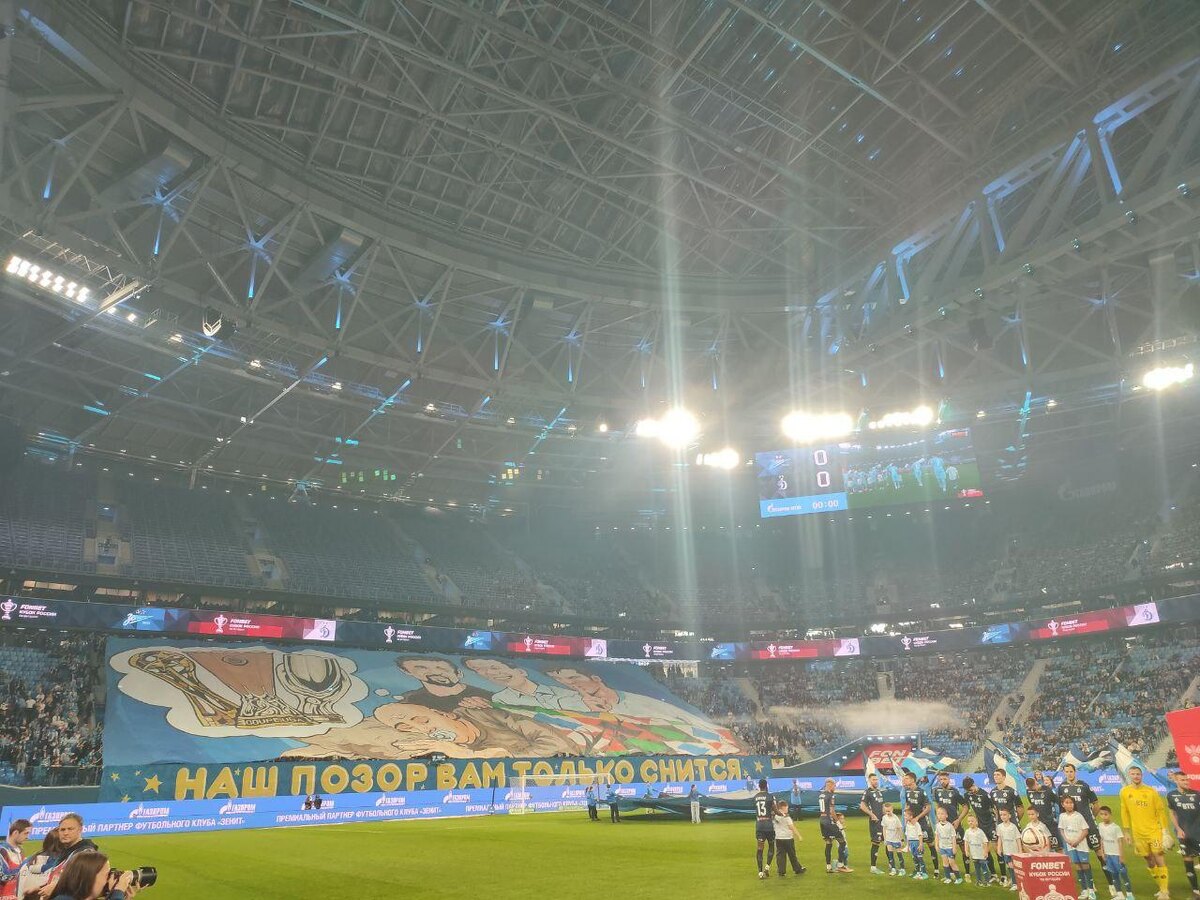 Болельщики «Зенита» ответили на оскорбительную кричалку, развернув баннер с надписью «Наш позор вам только снится». Плакат появился на трибуне «Газпром Арены» во время четвертьфинального матча Кубка России против московского «Динамо», сообщает корреспондент «Петербургского дневника». Этой фразой фанаты петербургской команды ответили на популярную среди соперников кричалку «Зенит – позор российского футбола». «Зенит» считается одной из самых титулованных команд страны: клуб – обладатель Кубка и Суперкубка УЕФА, а также десятикратный чемпион России. Как сообщал «Петербургский дневник», за безопасностью во время игры «Зенита» и «Динамо» следят более 500 силовиков.