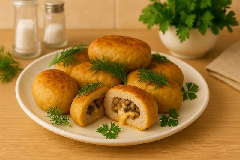 Для теста: • Картофель — 700 г • Яйцо — 1 шт • Мука — 3–4 ст. л. • Соль — по вкусу Для начинки: • Грибы (шампиньоны или лесные) — 200 г • Лук — 1 шт • Сыр (твердый) — 100 г • Сливочное масло — 20 г • Соль, перец — по вкусу • Растительное масло для жарки