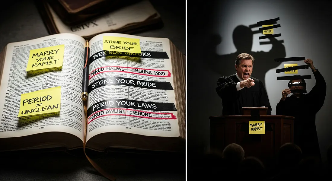 Забудьте о лозунге «один мужчина — одна женщина». В Ветхом Завете многожёнство встречается сплошь и рядом. Авраам, Иаков, Давид, Соломон — все имели нескольких жён и наложниц. И Бог никогда не осуждал их за это. Тем не менее современные церкви утверждают, будто однополые браки разрушают общество, и при этом делают вид, что царь Соломон не руководил крупнейшим гаремом в мире. Если моногамия так священна, почему же «святая книга» разрешает праведникам собирать женщин, как коллекционные карточки? В Левите 18 и 20 ясно сказано: не прикасайся к женщине во время месячных. Если ты всё же это сделаешь — вы оба «нечисты» на неделю. Кровать, одежда, стулья — всё, к чему прикасались, считается осквернённым. По сути, менструация превращает женщину в радиоактивный объект. Церкви редко упоминают это, ведь тогда половина их прихожанок оказывалась бы «нечистой» раз в месяц. Истина в том, что эти законы писались мужчинами для мужчин — теми, у кого было несколько жён. Если одна «временно недоступна», он