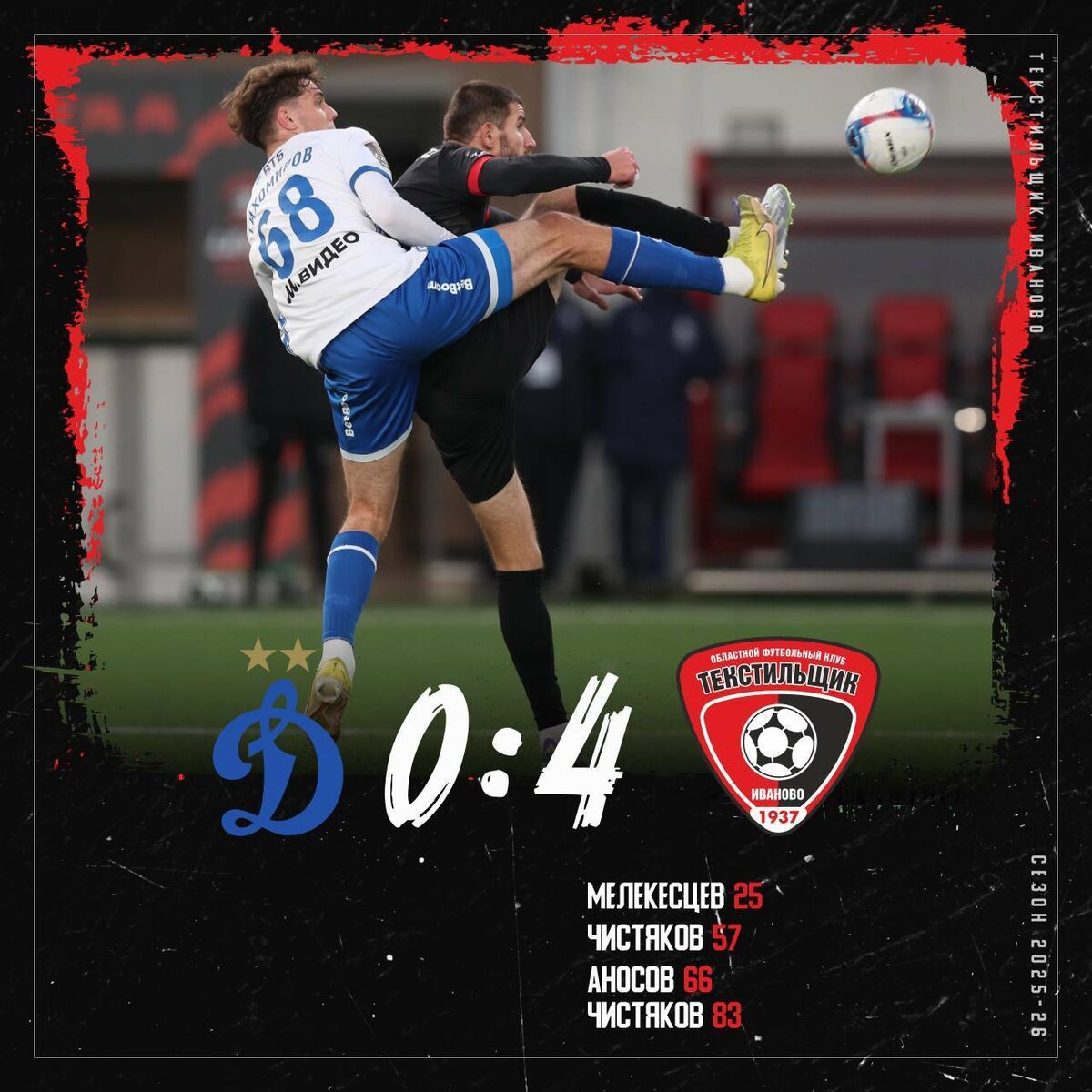 Ивановский «Текстильщик» на выезде разгромил местное «Динамо-2» 5 ноября ивановский футбольный клуб в Химках встречался с «Динамо-2». Предыдущая встреча команд завершилась ничьей, 2:2. В сегодняшнем матче болельщики также увидели четыре забитых мяча, однако все они прилетели в ворота хозяев. «Красно-черные» открыли счет на 25-й минуте: форвард Тимур Мелекесцев забил пенальти. На перерыв ивановцы отправились со счетом на табло 0:1. Во втором тайме темп игры, казалось бы, стал спокойнее, но на 57-й минуте Никита Чистяков забил второй гол в ворота соперников, а на 66-й Данила Аносов оформил третий мяч. На этом «Текстильщик» не остановился: под конец встречи Чистяков сделал дубль и счет стал разгромным – 0:4.