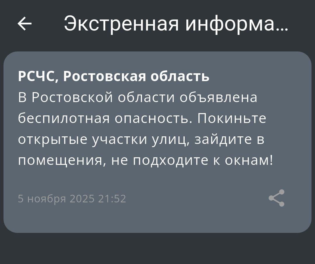 ❗В Ростовской области объявлена беспилотная опасность Об этом сообщили в РСЧС. Жителям региона рекомендуется зайти в помещения и отойти подальше от окон.