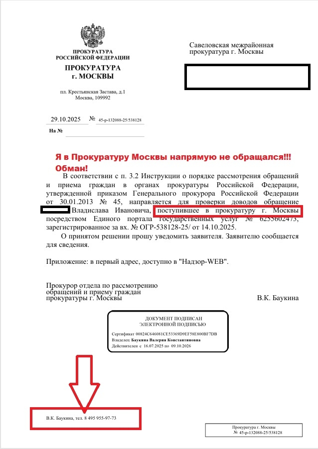 Как прокуратура сама себя проверяла: история абсурдной жалобы, которая вернулась к отправителю 7 месяцев меня кидали по инстанциям. Результат — ноль Подача обращения в органы прокуратуры № 6371394229. Действия. Заявление получено ведомством. Сегодня в 21:58 ЖАЛОБА в Генеральную прокуратуру Российской Федерации на системные нарушения должностными лицами прокуратуры г. Москвы сроков рассмотрения обращений и порядка их перенаправления, приведшие к блокировке защиты прав гражданина Настоящим я вынужден обратиться к Вам в связи с вопиющими и системными нарушениями законодательства, допущенными прокурором отдела по рассмотрению обращений прокуратуры г. Москвы В.К. Баукиной при рассмотрении моих обращений. 1. Хронология нарушений: С февраля 2025 года я неоднократно обращался в органы прокуратуры с жалобами на нарушения со стороны ПАО «МТС» и бездействие нижестоящих прокуроров. Однако вместо восстановления прав, я столкнулся с циничной системой нарушений: 29.10.2025 В.К. Баукиной было подготов