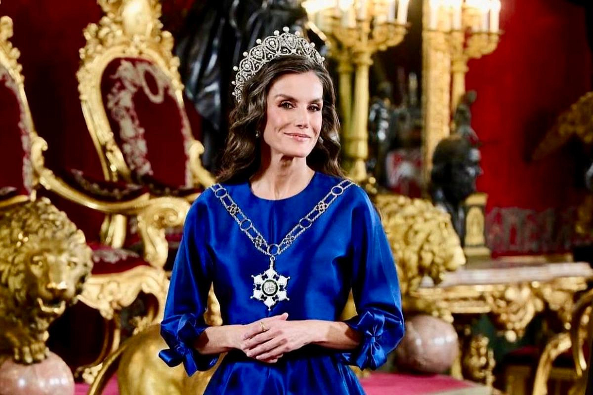 Королева Летиция в синем атласе и «русской» тиаре Салон Тронного зала Мадридского дворца отразил синий отблеск атласа: королева Летиция выбрала лаконичное платье в пол и полный парад знаков отличия.