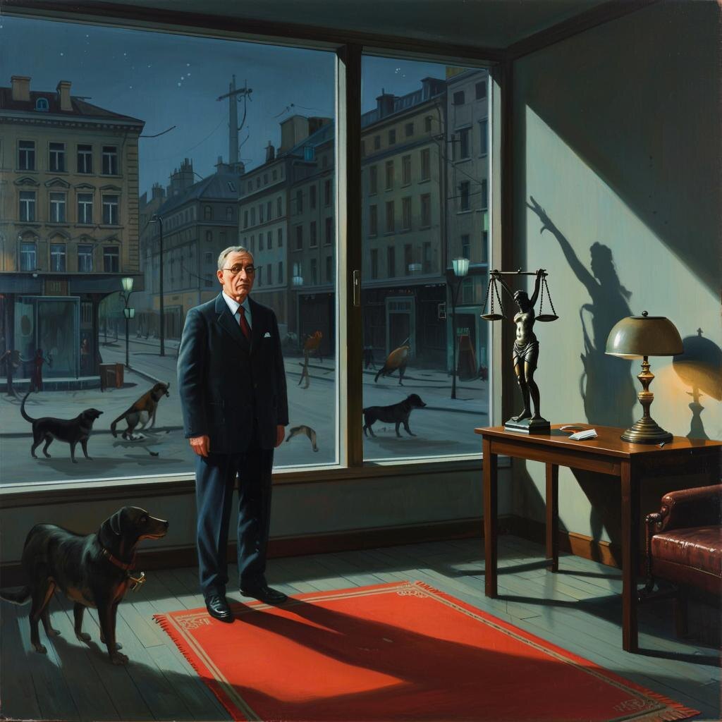 За массивным столом, который один мог бы решить вопрос с бездомными собаками, просто навалившись на них всем своим политкорректным весом, сидел Аристарх Ферапонтович Ответов. Министр Ответственности. Он и выглядел как ответ – дорогой, но поношенный костюм, седые виски, впалые щеки, на которых читалась усталость от всех возможных и невозможных последствий. Он смотрел в монитор, где геометрические фигуры, обозначавшие электоральные настроения, медленно расползались, как студень по тарелке. Иногда отвлекался на фигурку Фемиды, которая стояла у него на столе, явно мысленно проводя эксперимент, какое из принятых им решений перевесит чашу его карьеры.