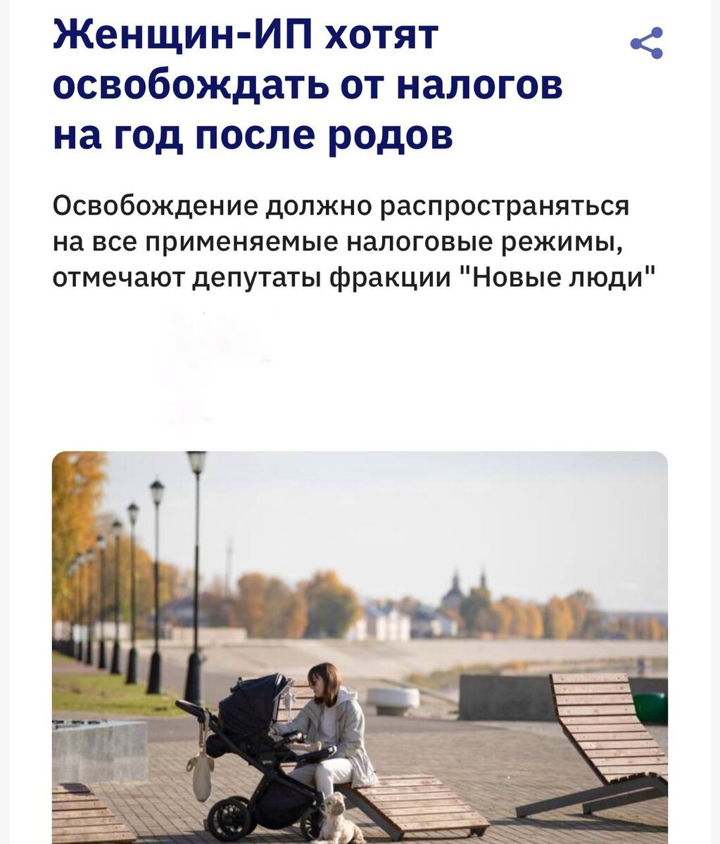 В Госдуме предложили освобождать женщин-ИП от налогов Условие — родить ребёнка. Льготный налоговый режим будет действовать год после родов. Чиновники считают, что инициатива поможет не закрывать бизнес на время декрета. Декрет — новый налоговый лайфхак.