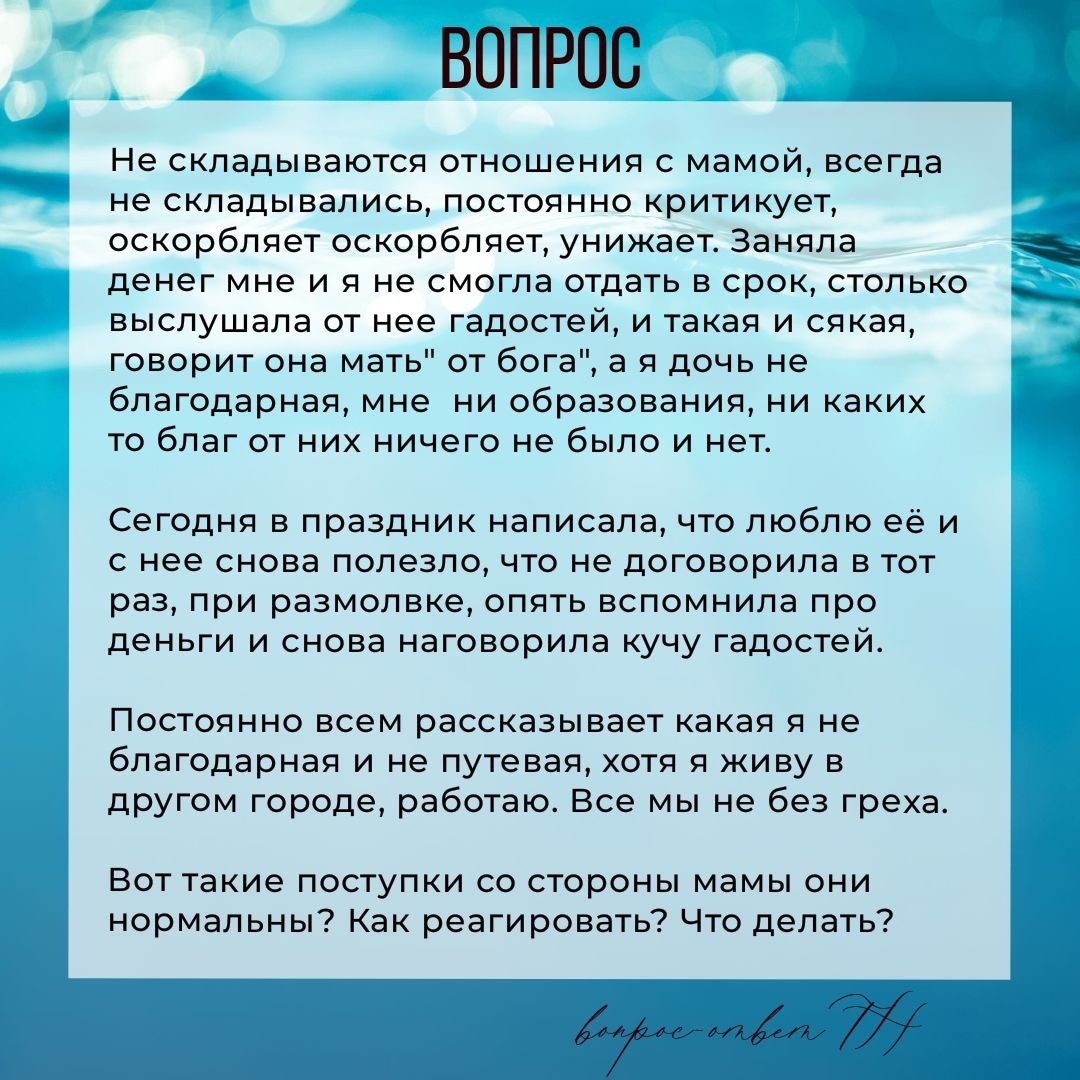 Грустно, конечно, такое читать. Очень жаль, что с мамой так🙏 Оценить поступки мамы можете только вы. Как вам? Не мне судить. К сожалению, со стороны матерей бывает и ревность, и конкуренция, и зависть, это кажется странным, но оно есть. Взрослость не равно зрелость. И здесь очень много грусти. Как реагировать? Говорить из Я - позиции. О ваших чувствах относительно ситуаций. Заботу давать себе самой. Использовать разные практики: трансформационные игры (Например "Океан маминой любви"), практику "Добаюкивание". Я сама их проходила, мне стало легче. Сосредоточиться на своей жизни. Относительно долгов: есть такое правило - дарить ту сумму, которую не жалко. В долг не давать никому. Для этого есть финансовые организации. А вот помочь, подарить - да. Книги про отношения с мамой здесь. #вопросответТН