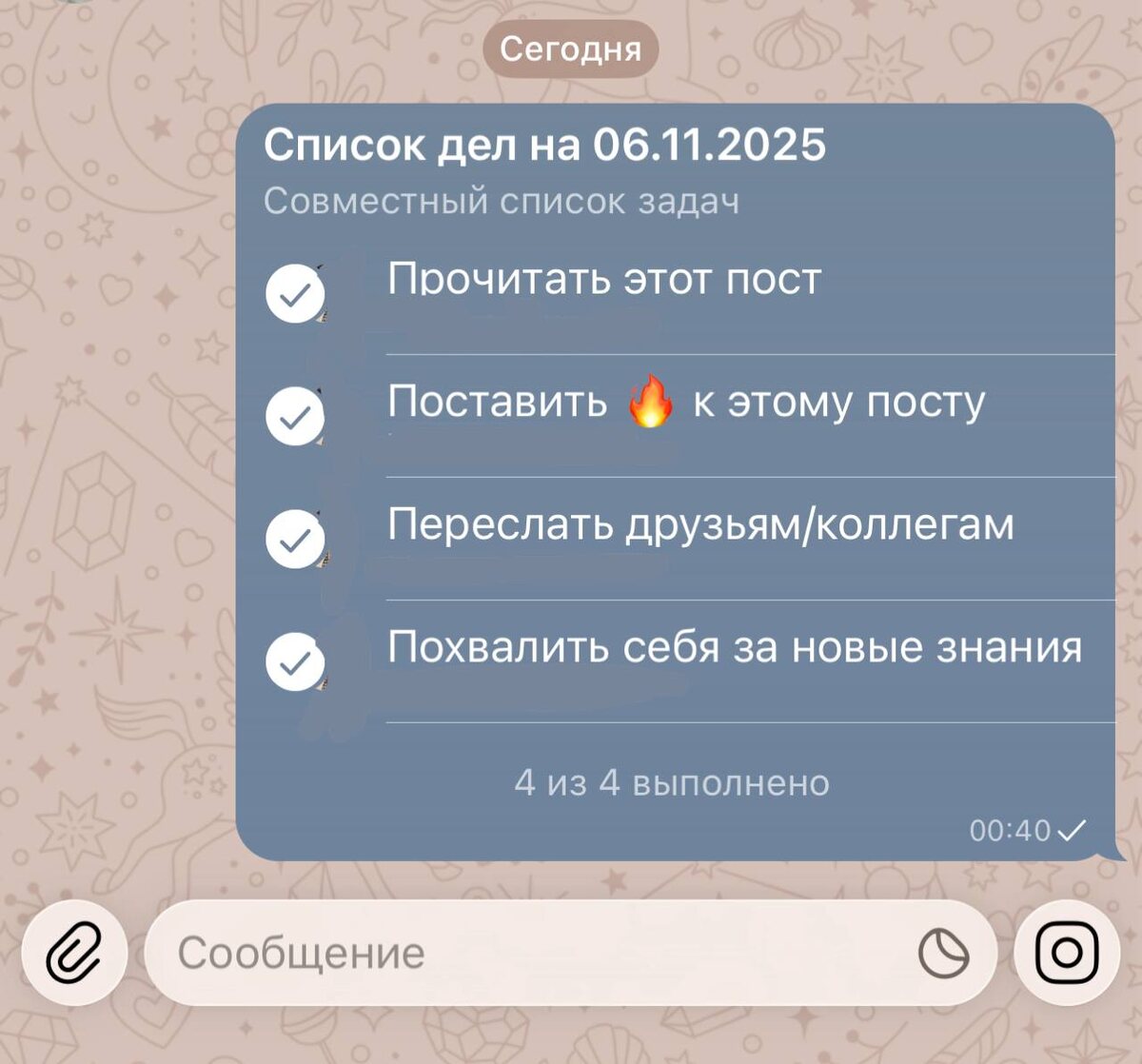 📱 В Telegram новое интересное обновление, пригодится и в работе и дома С выходом последнего обновления ТГ прямо в чатах появились интерактивные doit‑чеклисты. Очень интересный шаг 🔥 У меня сразу разыгралась фантазия о том, где я могу это использовать, а если у вас команда, то это точно нужно. Еще будет полезно для личных задач, а я люблю расписывать себе план на день/неделю, еще для семейного чата очень подойдет (я представляю как кидаю всем список дел, которые нужно сделать 😄), даже представила как я кидаю список задач моим клиентам (как ромашек задание) и наблюдаю за их эффективностью 😉😉 И так, теперь доступен: - контроль задач прямо в ТГ - возможность создавать список до 28 пунктов - устанавливать, кто может отмечать задачу как выполненную или добавлять новые - комментировать каждую задачу - использовать списки можно в личных чатах, группах, в избранном Как создать список задач: 1. Откройте чат (группу или «Избранное») где хотите создать список задач 2. Нажмите на скрепку (