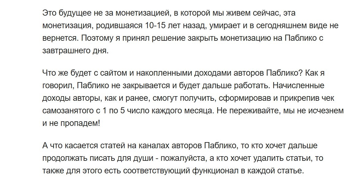 Ребят! Сразу извиняюсь перед всеми , потому что нервы сдали, и я просто несу поток мысли! Сейчас прилетела очередная радость " " , в этот раз от сайта " Паблико" . https://pabliko.ru/@pabliko/chto_izmenitsja_vo_vneshnem_vide_i_monetizatsii_pabliko-334051/ То есть ( как я поняла) теперь все кто там пишет - пишете за спасибо .