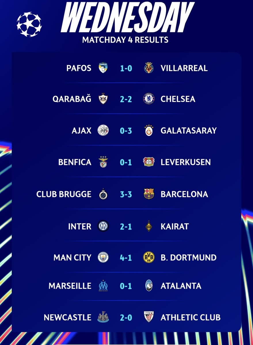 «Пафос» творит главную сенсацию игрового дня, добывая первую победу для клуба в своей истории в Лиге чемпионов. «Вильярреалу» не хватило класса вскрыть низкий оборонительный блок «Пафоса». «Челси» едва уносит ноги из Баку. «Карабах» – одна из сенсаций общего этапа, команда постепенно набирает очки от матча к матчу и впервые не проигрывает клубу из Англии. Хет-трик Осимхена приносит победу «Галатасараю» в гостях над «Аяксом». Амстердамцы замыкают турнирную таблицу. «Бенфика» Моуриньо обстучала ворота «Байера», но так и не пробила Флеккена. Немецкий клуб реализовал единственный момент и увозит победу из Португалии. Лиссабонцы сенсационно пока без очков. «Брюгге» вынудил «Барселону» весь матч быть в роли догоняющего. Слишком многое каталонцы позволили создать бельгийцам у своих ворот и едва не упустили ничью, 4-й гол «Брюгге» отменили. Казахский «Кайрат» распечатывает ворота Яна Зоммера в Лиге чемпионов. Аугусто вколотил победный мяч в ворота гостей и делает «Интер» третьей командой с ма