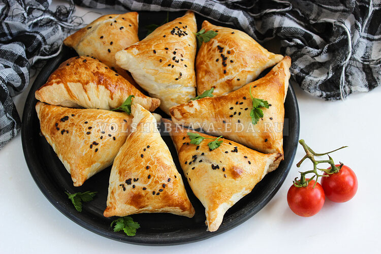 Очень простой и быстрый рецепт приготовления «ленивой» самсы — из готового слоеного теста, с начинкой из фарша и лука, со специями. Если вы заранее разморозите тесто, то процесс формовки у вас займет не более 10 минут, выпекание — 20 минут. Итого 30 минут, чтобы приготовить очень вкусные слойки-треугольники с мясом. Они будут хрустящими, с сочной и невероятно ароматной начинкой. Совет! Фарш можно взять любой. Если используете куриный, то советуем включить в список ингредиентов сливочное масло — разложите по маленькому кусочку масла в начинку, когда будете формировать самсу. При выпечке масло растает, сделав начинку сочнее, не даст ей пересушиться. Общее время: 30 минут | Время приготовления: 20 минут