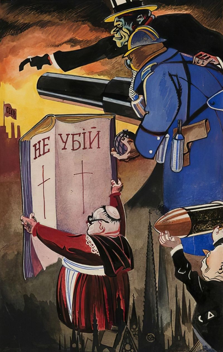 Как нетрудно понять, это такой осовремененный ремейк одноимённого классического пейзажа Исаака Левитана. Напомню, как он выглядит: Исаак Левитан (1860—1900). Над вечным покоем. 1894 1938. «Венское выступление «фюрера». К «аншлюсу» Австрии» 1939. «Новое в обработке земли. (В Западной Белоруссии). Сначала уборка, а потом уже сев»