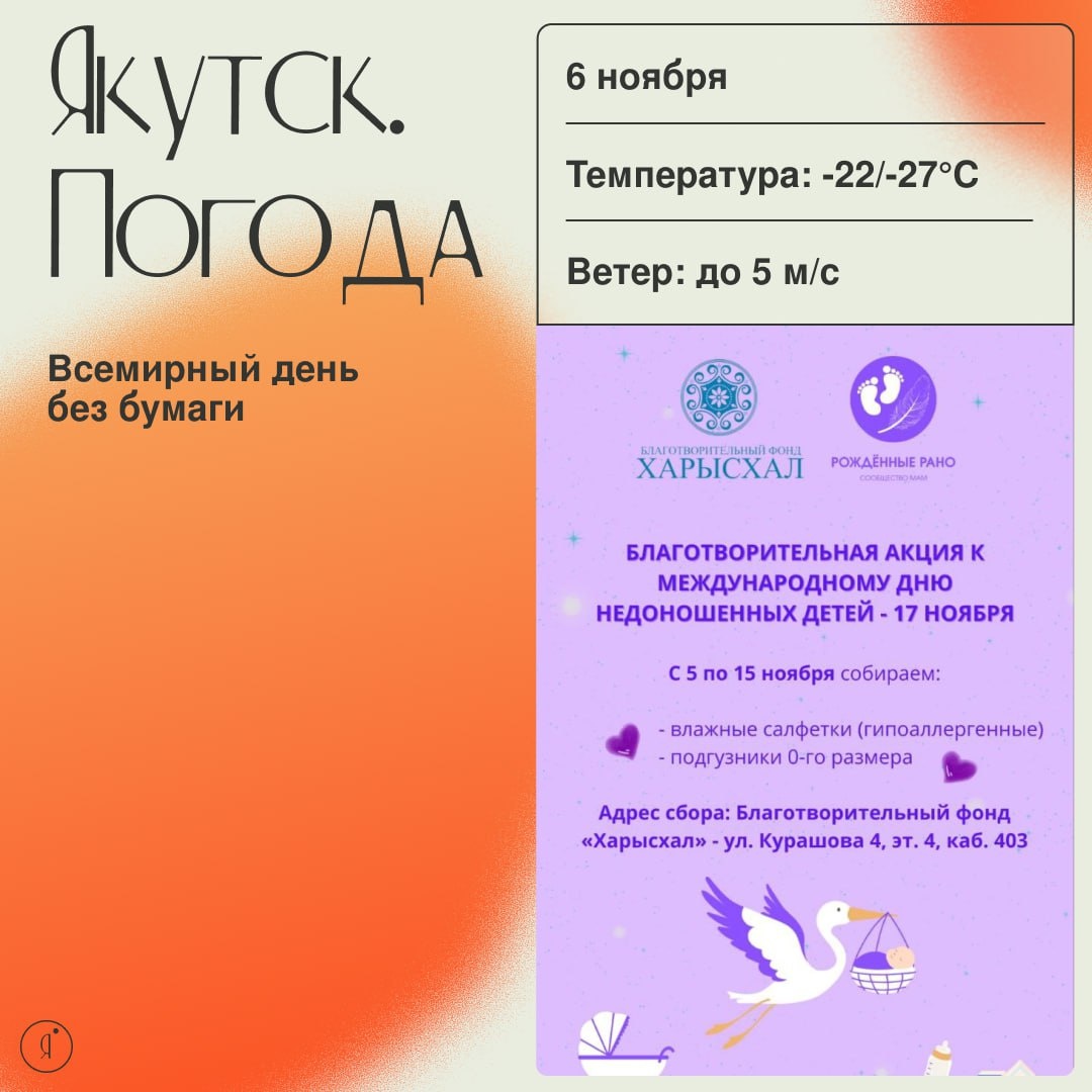 Доброе утро! Фонд «Харысхал» и сообщество «Рожденные рано» приглашают принять участие благотворительной акции посвященной поддержке самых маленьких пациентов перинатального центра - недоношенных малышей Акция проходит с 5 по 17 ноября. В это время октрыт сбор влажных салфеток и подгузников размера 0, чтобы помочь родителям обеспечить комфорт и заботу своим малышам. Все собранные вещи можно приносить по адресу: 🤩 Благотворительный Фонд «Харысхал» ул. Курашова, 4, эт. 4, каб. 403 «Ваша поддержка – это не просто материальная помощь, это проявление сочувствия и заботы, которые могут помочь существенно облегчить жизнь недоношенных детей и их семей. Сделайте шаг навстречу маленьким героям!» – призывают организаторы. Online Якутия | Ждем вас в МАХ