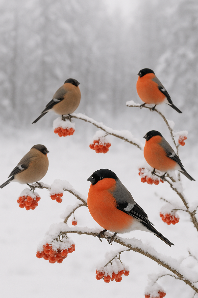 Было это два года назад. Мы с друзьями выбрались на рыбалку — на речку Етыпур. Это моё основное место, если, конечно, есть дорога или хоть какая-то возможность туда добраться. Всё как обычно: тишина, разговоры с друзьями, удочка покачивается в лунке, солнце пригревает, хоть и мороз под тридцать. И вдруг боковым зрением замечаю в лесу красные пятна. Сначала подумал — показалось. Повернулся, прищурился… На небольшой, занесённой снегом рябине будто повисли яркие, алые яблоки. Я даже протёр глаза — не верится. Подошёл ближе и понял: это снегири! Целая стайка, штук восемь или десять. Самцы — ярко-красные, грудки словно горят на фоне снега, а самки — поскромнее, серовато-розовые, но тоже красивые. Они перебирали веточки, щипали засохшие ягодки и посвистывали что-то тихо, по-зимнему нежно. Я стоял, не шевелясь, боясь спугнуть. Последний раз я видел снегирей лет десять назад — и вот они снова здесь. Снегири вообще птицы северные, но на Ямале они — редкие гости. Чаще всего их можно встретит