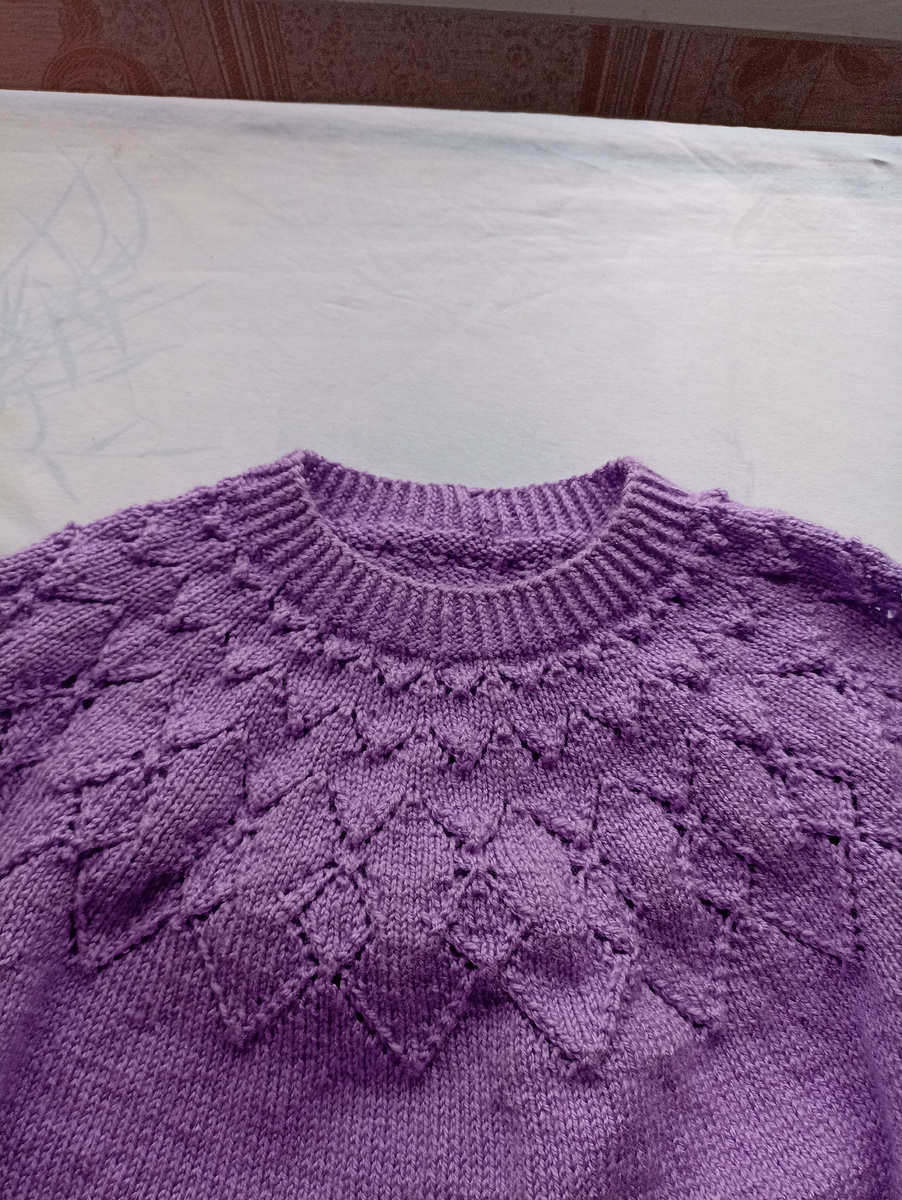 Друзья! Всем здравствуйте ! Все таки зацепила меня кофточка круглой кокеткой сверху. Кто со мной на канале наверное знает что вязала кофточку круглой кокеткой Вязала и перевязывала. Вначале был один узор с переносом петель , со своими изменениями. Кокетка села на фигуру нормально , красивая ,но не понравилось то что получился ненужный объём на груди. / Распустила/ А как я уже писала природа наградила меня пышноватыми формами в верхней части тела. Кстати я даже шарф под верхнюю одежду не ношу , потому что на груди получается ,,гора,, Стараюсь вязать шарфы ажурные , прозрачные . На канале где то должны быть два видео по вязанию шарфа на вилке и шарфа на линейке с помощью крючка . Девчата у кого такие же проблемы пишите найду видео и покажу как вяжутся такие ажурные тонкие , но теплые шарфики . Но вернёмся к кофточке . Кокетку перевязала , взяла другой узор и кофточка готова .Ушло менее 400 го. Осталось полтора мотка пряжи и я решила выпишу ещё три и свяжу ещё одну такую же кофточку