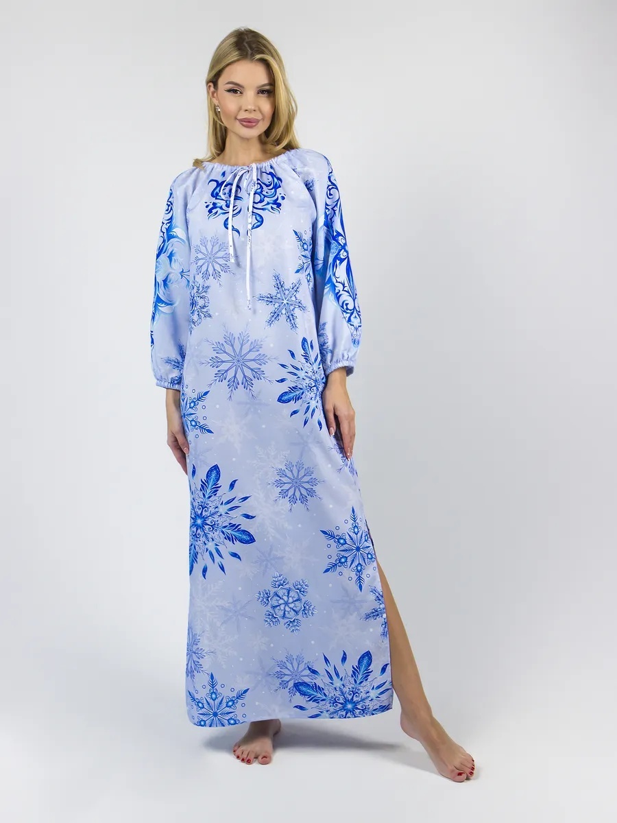 Это платье в славянском стиле с зимним узором «Снежинки» — прекрасный пример того, как традиционный крой может выглядеть современно и элегантно. Прямой силуэт с боковыми разрезами обеспечивает свободу движений, что особенно важно для праздничных хороводов или выступлений. Горловина на завязках не только добавляет этнического колорита, но и делает процесс надевания максимально удобным. Резинка по низу рукава мягко фиксирует его, не пережимая запястье, что оценит каждая обладательница.