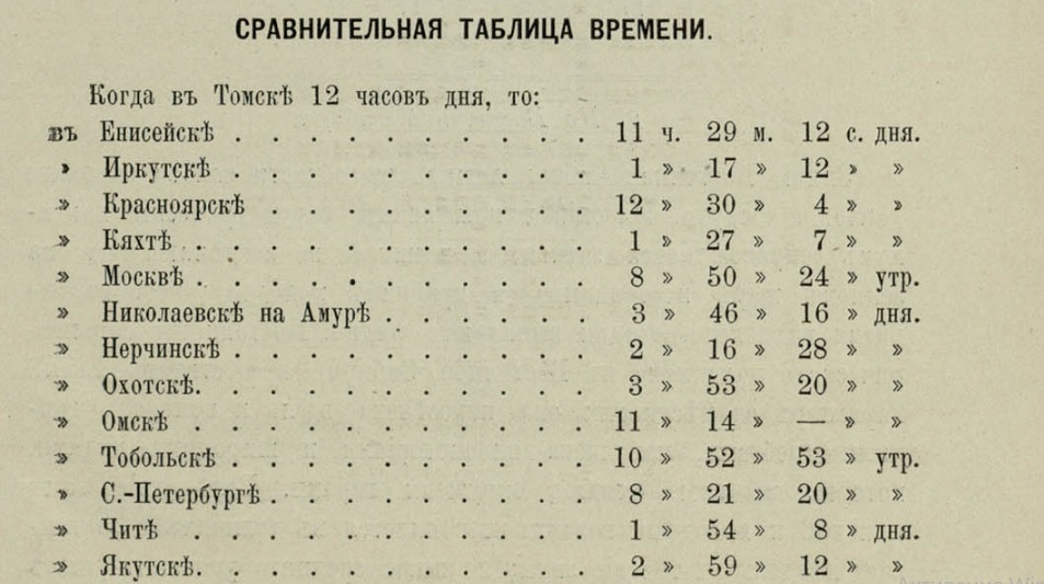 Сто лет назад в Сибири (и в Российской империи вообще) не было никаких часовых поясов. В каждом крупном городе время было свое и отличалось от соседей не только часами (как теперь), но и минутами. Например, когда в Санкт-Петербурге кукушка, выбираясь из настенных ходиков, сообщала о наступлении полдня, в Москве часы показывали 12 часов 29 минут, в Архангельске - 12 часов 33 минуты, в Ярославле - 12 часов 38 минут, а в Нижнем Новгороде - 12 часов 56 минут. То же касалось и городов Сибири. Когда кукушка в полдень просыпалась в Томске, в Омске еще было 11 часов 14 минут, а в Тобольске - 10 часов 52 минуты. Для того, чтобы россияне не запутались в этом временном хаосе при переезде из одного города в другой, в календарях печатались специальные таблицы. Источник: "Сибирский торгово-промышленный календарь на 1884 год" Впрочем, образованный человек мог и сам рассчитать время по специальной формуле: М= Т0+Δ. М - местное время, Т0 - время по Гринвичу, Δ - географическая долгота конкретн