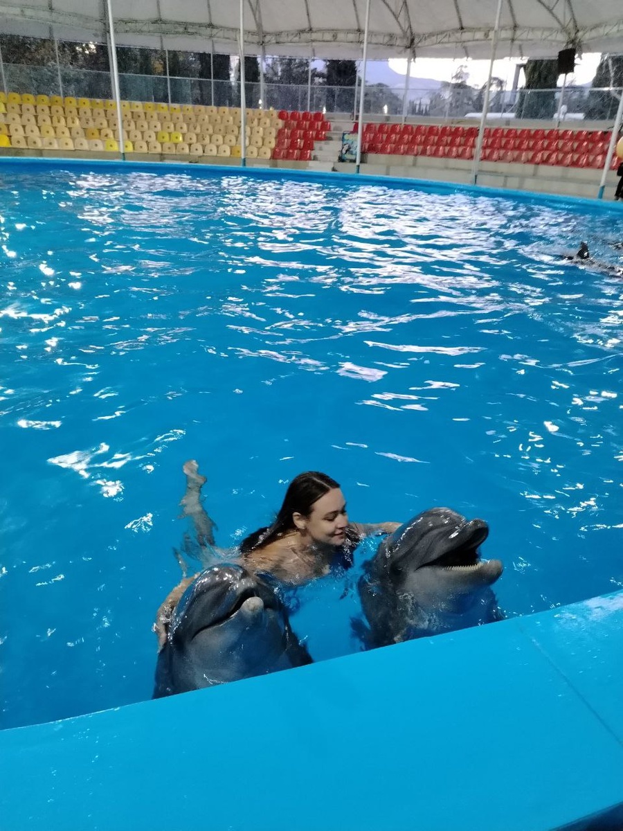 Те, кто со мной лично знаком, знают, что я обожаю море и дельфинов. Одной из заветных мечт было поплавать с этими прекрасными, умными млекопитающими. И мечта исполнилась! Мы с мужем решили посетить дельфинарий в Алуште, но было немного сложно выбрать (кто не знает – их там два). Наш выбор пал на Дельфинарий на Ревкомовский пер., 10 и мы не пожалели! Цены приемлемые, да и поплавать с дельфинами стоит не так уж и дорого. В Петербурге еще давно-давно, когда существовал дельфинарий, ценник был почти таким же. Само представление длилось примерно 30 минут, в выступлении принимали участие 5 дельфинов. Один из них еще совсем крошка, он только привыкал к публике, в основном кушал рыбку, делал легкие трюки и показывал, как любит, когда ему чешут пузико. Другие уже – опытные. Очень понравилось, как работала с дельфинами девушка-тренер, чувствовалась любовь и трепет. Дельфины ее слушались и словно принимали за свою. После выступления, я побежала исполнять мечту! Честно, сначала было чуток страшно,