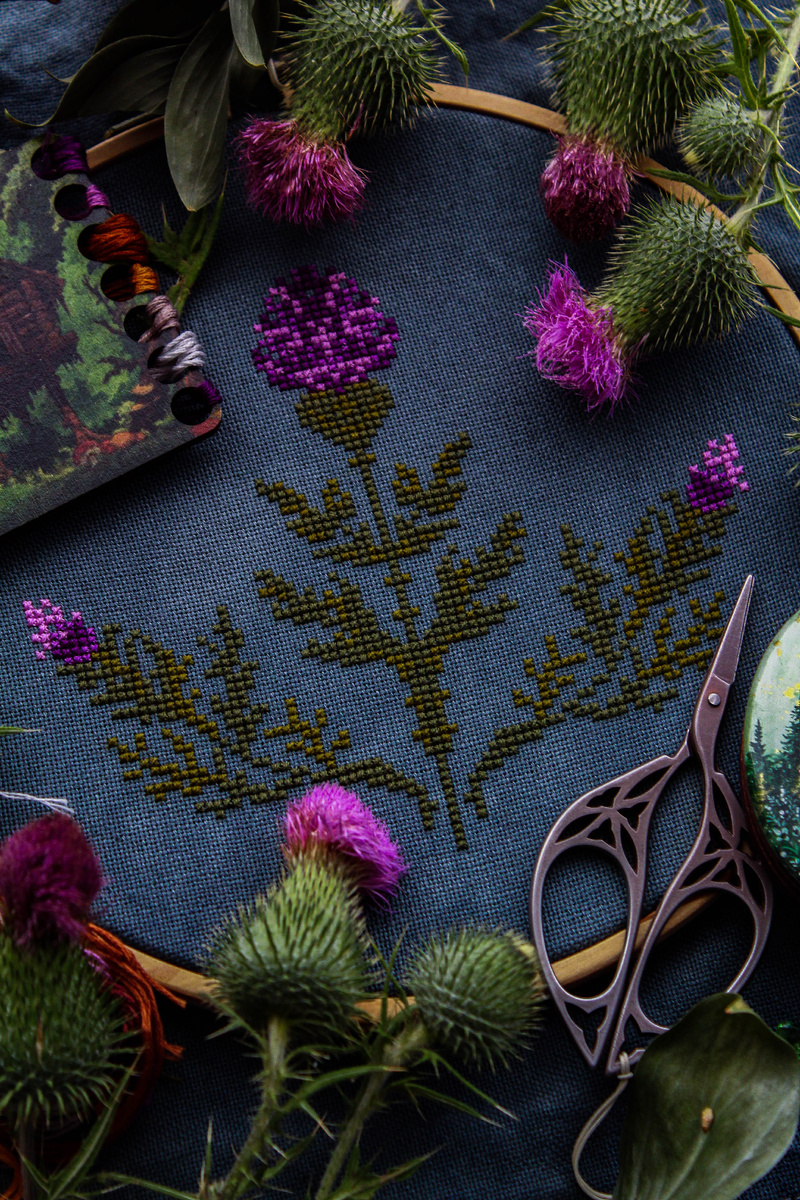 Схема с «Волшебным чертополохом» была найдена мною давно на просторах Pinterest и лежала бы ещё долго, дожидаясь своего часа. Но на днях я увидела у нас возле дома большой и обильно цветущий куст этого растения. Это было мгновенное вдохновение! Такое сильное, что я стартовала в тот же день, несмотря на совсем другие планы. Вышивая эту работу очень хочется оформить её во что-то прикладное, но я никак не могу подобрать подходящую ткань. Очень хочется холоп с красивым принтом, но всё, что нахожу не то... Может быть, Вы что-то посоветуете? Тёмное, винтажное, волшебное… Самым сложным в этой работе было передать оттенок основы и мне кажется, что ни разу на всех этапах фотографирования мне это так и не удалось! Я красила эту основу не за один подход, пока не добилась того самого сине-голубо-сизе-туманного эффекта, который ассоциируется у меня с дымом от сухих заколдованных трав… Изначально я хотела добавить сюда немного бисера, но отказалась от этой идеи в пользу практичности, потому как есть
