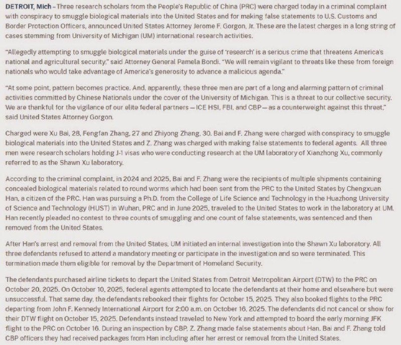 ❗DoJ charges 3 more Chinese nationals at Univ. of Michigan for ‘SMUGGLING’ biological materials