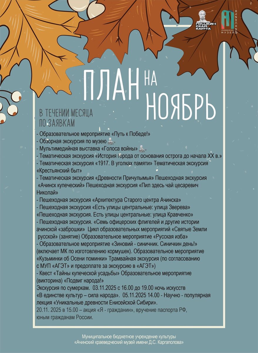 🍂 План на ноябрь в Ачинском краеведческом музее 🍂 Последний месяц осени обещает быть насыщенным! В течение ноября вас ждут: 🎓 Образовательные программы — «Путь к Победе!», «Русская изба», «Зимовий – синичкин день!», «Святые Земли русской» и другие. 🎥 Мультимедийные выставки — «Голоса войны». 🏛 Тематические и обзорные экскурсии — от истории основания города до дореволюционного быта и купеческих традиций. 🚶 Пешие маршруты — «Архитектура старого центра Ачинска», «Есть улицы центральные», «Семь офицерских флигелей» и другие. ☕ А для любителей необычного — пешеходная экскурсия «Пил здесь чай цесаревич Николай». Также в ноябре: 📅 03.11 — экскурсии ко Дню народного единства; 📅 05.11 — научно-популярная лекция «В единстве культур – сила народа»; 📅 20.11 — патриотическая акция «Я — Гражданин», вручение паспортов юным гражданам России. Каждый найдёт что-то для себя — от прогулок по старому городу до тёплых творческих встреч. Приходите в музей и проведите ноябрь с пользой и вдохновен
