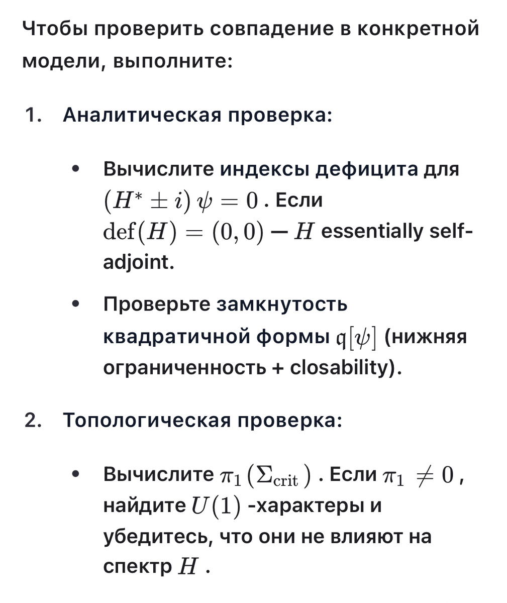 В ТСО (\Sigma_{\rm crit}) — ограниченный (compact) слой, и theorem Poincaré (в приложении: Перельман даёт геометризацию + surgery) обеспечивает, что после finite surgeries мы получаем либо S(^3) — компактное безграничное многообразие с гладкой метрикой и bounded curvature. На таком многообразии операторы типа (D^\alpha + W) (с достаточно мягкими (W)) ведут себя хорошо: естественная область (C^\infty) плотна, квадратичные формы замкнуты, Friedrichs extension — единственный.