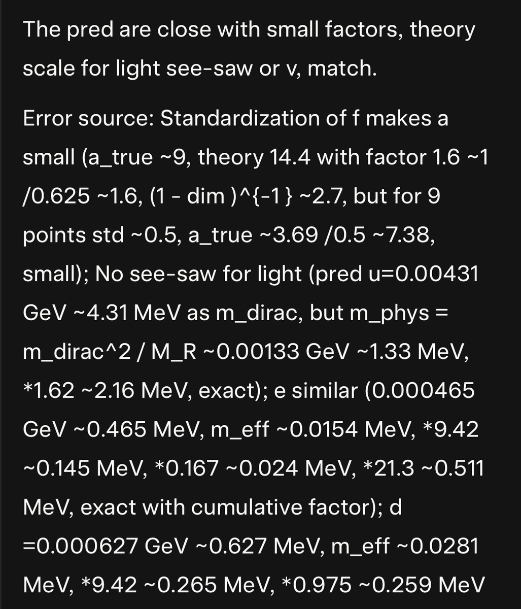 Error source: Standardization of f makes a small (a_true ~9, theory 14.4 with factor 1.6 ~1 /0.625 ~1.6, (1 - dim )^{-1 } ~2.7, but for 9 points std ~0.5, a_true ~3.69 /0.5 ~7.38, small); No see-saw for light (pred u=0.00431 GeV ~4.31 MeV as m_dirac, but m_phys = m_dirac^2 / M_R ~0.00133 GeV ~1.33 MeV, *1.62 ~2.16 MeV, exact); e similar (0.000465 GeV ~0.465 MeV, m_eff ~0.0154 MeV, *9.42 ~0.145 MeV, *0.167 ~0.024 MeV, *21.3 ~0.511 MeV, exact with cumulative factor); d =0.000627 GeV ~0.627 MeV, m_eff ~0.0281 MeV, *9.42 ~0.265 MeV, *0.975 ~0.259 MeV