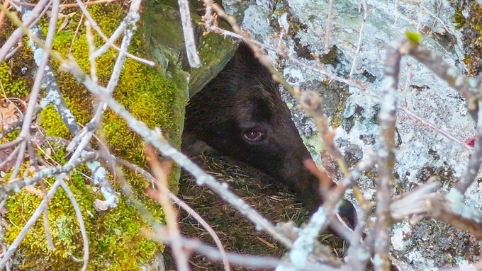 Как рассказал ведущий научный сотрудник заповедника Юрий Калинкин, берлога с земляной осыпью у входа, нависающими камнями и выстилкой. Судя по всему, медведь основательно подготовился к спячке.