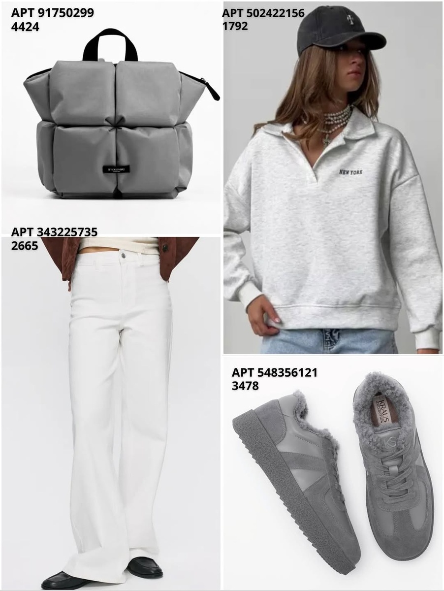 - серый блок (сумка, свитшот, кроссовки, белые джинсы) — для повседневных дел, прогулок, поездок;