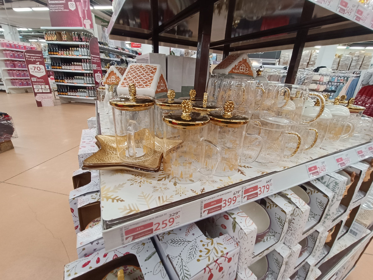Я хоть и не собираюсь ничегошеньки покупать в этом сезоне для новогодней сервировки стола (купленные сегодня четыре праздничных салфетки из Фикс Прайс не считаются🤭), но посмотреть на праздничную посуду люблю. И потом, всегда есть вероятность, что что-то да надо🤣 А может и не надо, но хочется 😁 Так что сегодня продолжаю рассказывать о праздничных товарах для дома и стола из гипермаркета "Ашан" (Москва, м. Молодёжная) В этом сезоне там действительно есть на что взглянуть. Огромный выбор кружек из боросиликатного стекла с золочёными крышками, украшенными шишками. Мне очень понравились огромные банки с золотыми оленьими рогами, в неё и печенье можно сложить, и как упаковку для подарка использовать. Баночки в виде ёлочек тоже симпатичные, но в другое время года будут не очень уместны, а значит встаёт сразу вопрос - где это всё хранить целый год? Нет у меня ни места, ни ответа🤣 Новогодне-елочную тему продолжают всевозможные блюда и тарелки всех мастей. И бесконечные кружки. М