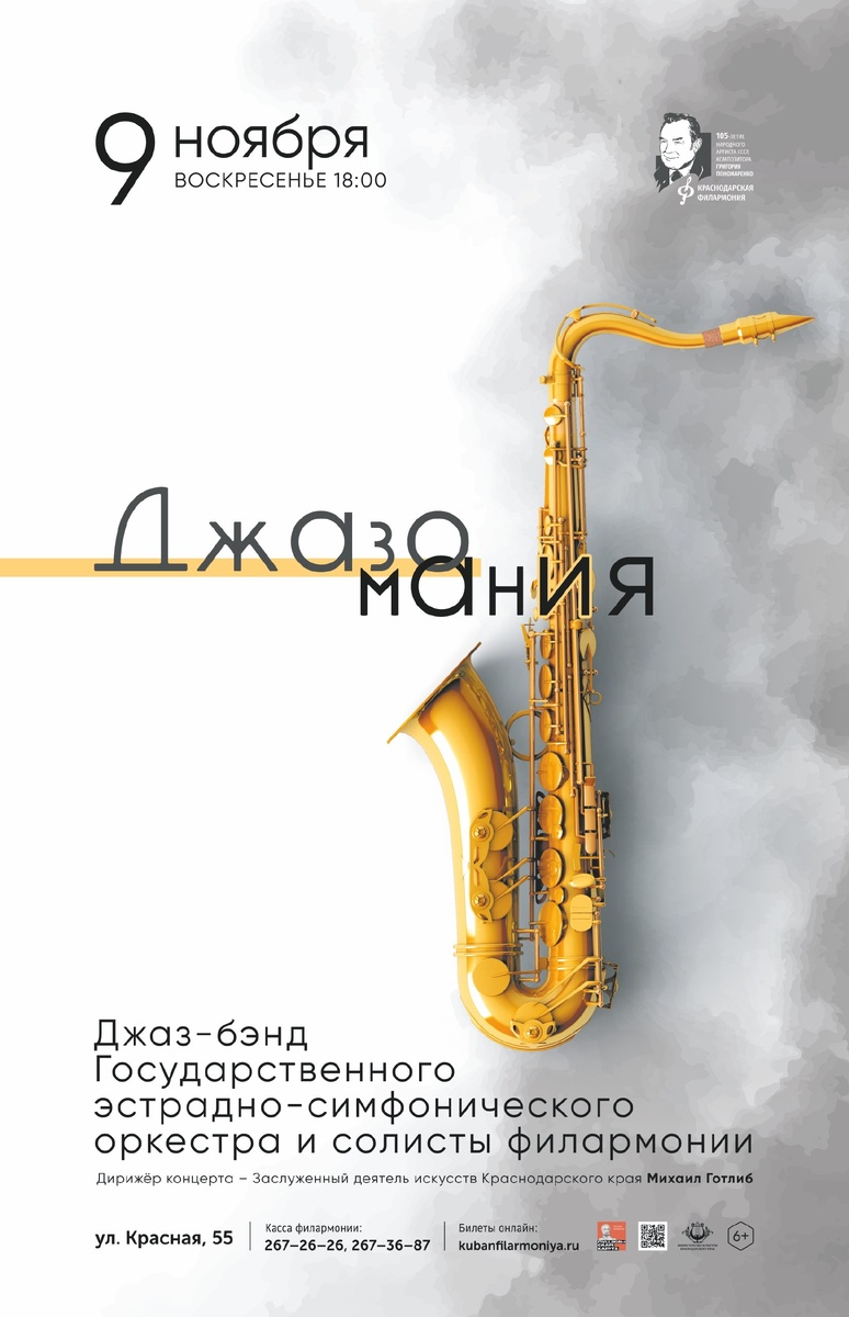 Концерт «ДЖАЗОМАНИЯ» 🎷✨ 9 ноября в 18:00 🗓⏰ Джаз — это не просто музыка, это целая вселенная импровизаций, неожиданных ритмов и глубоких эмоций, с которой здорово познакомиться лично в исполнении талантливых музыкантов джаз-бэнда Государственного эстрадно-симфонического оркестра🎺🎶 В программе прозвучат легендарные мелодии: от классики в исполнении оркестра с произведениями «K.K. Jazz» Казуми Тотаки и «Ellington Tribute» в честь великого Дюка Эллингтона до чувственных вокальных номеров — «Cry Me A River» 🎤💔 и проникновенной «But Not For Me» 🎙💫 Особое место займут современные интерпретации и музыкальные эксперименты — энергичный «Crunchy Frog» Гордона Гудвина и зажигательный «Spain» Чика Кориа 🎹 На сцене будет блистать звездный состав вокалисток: Заслуженные артистки Краснодарского края Ирина Бабичева и Мария Набокова 🌟🎤 Аделаида Авакян 🎶 Наталья Пенжоян 🎵 Джульетта Дилонова ✨ Дирижер концерта – Михаил Готлиб 🎼 Билеты: https://clck.ru/3LGSZw Ждём вас! 🙂