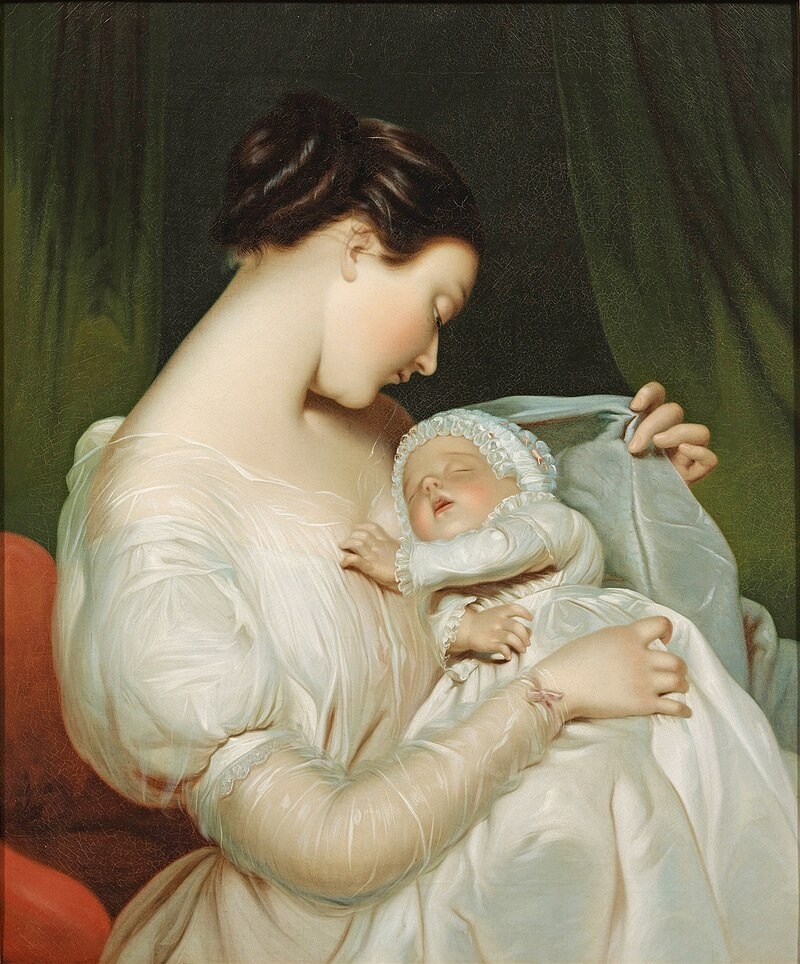 Он тщательно прописывает каждую складочку на воздушной ткани кофты женщины, складочки дорогой парчи юбки. Белая кожа женщины плавно переходит в перламутровые цвета одежды и одеяльца , которым укрыт ребенок. На розовом личике ребенка видны розовые щечки и губки слегка приоткрыты. Одна ручка лежит поверх одеяльца, а другую он держит на груди матери. Видна розовая шапочка с кружевами . Каждая складочка кружева настолько тщательно прописана. Женщина держит ребенка на коленях сидя вероятно всего на диване, а левой рукой она придерживает шаль, чтобы ребенку не дуло. красиво уложены волосы и видны спадающие несколько завитков волос на шее. Женщина смотрит на своего ребенка. Красивая женщина, утонченные черты лица, милое личико ,слегка розовые щечки, красивые руки, пальцы красиво нарисованы которыми женщина держит шаль. Заворажива