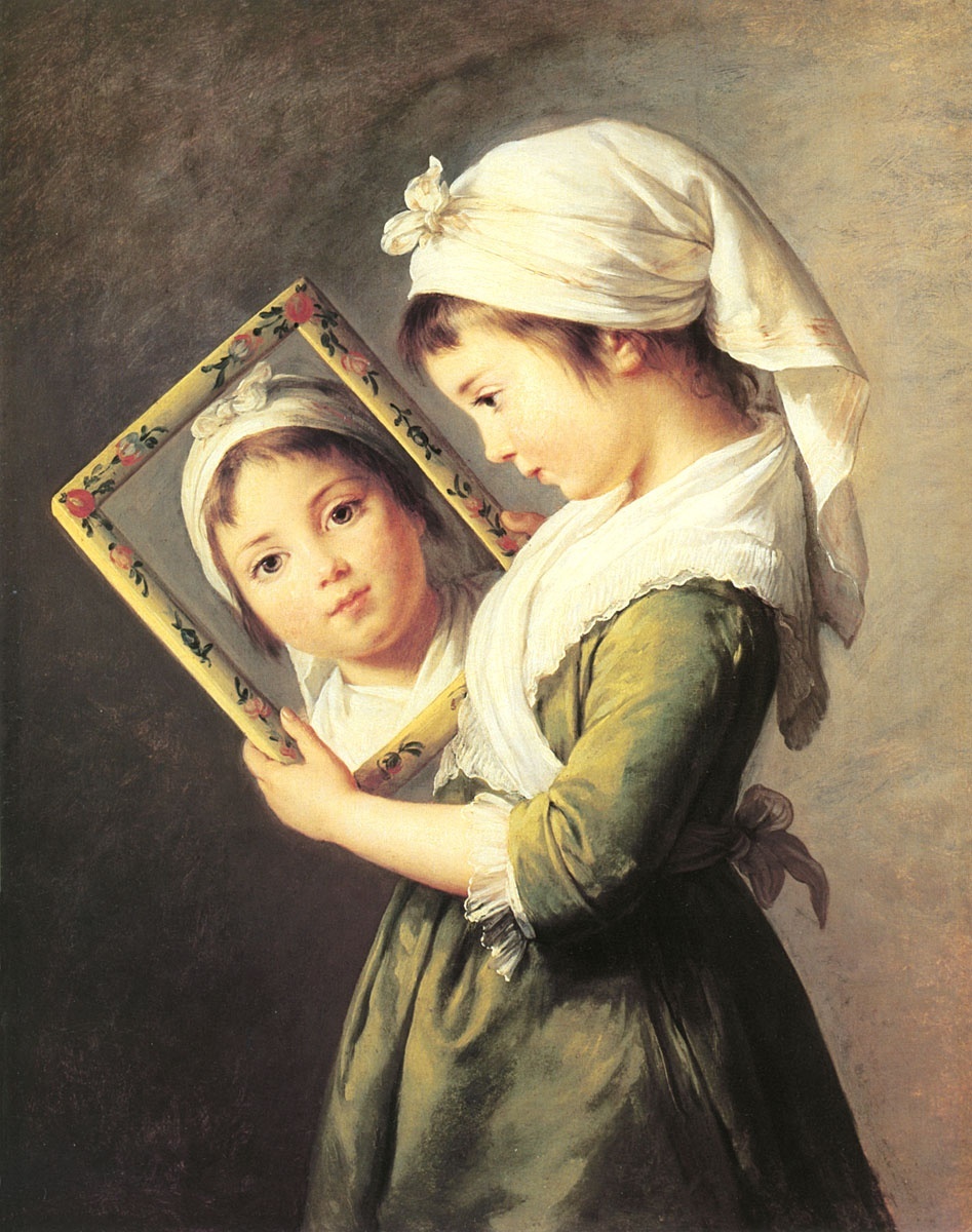 На одном полотне можно увидеть две картины. Фигурка девочки, стоящей боком, лицо изображено в ПРОФИЛЬ. Девочка смотрит в зеркало, на котором изображено лицо девочки в АНФАС .