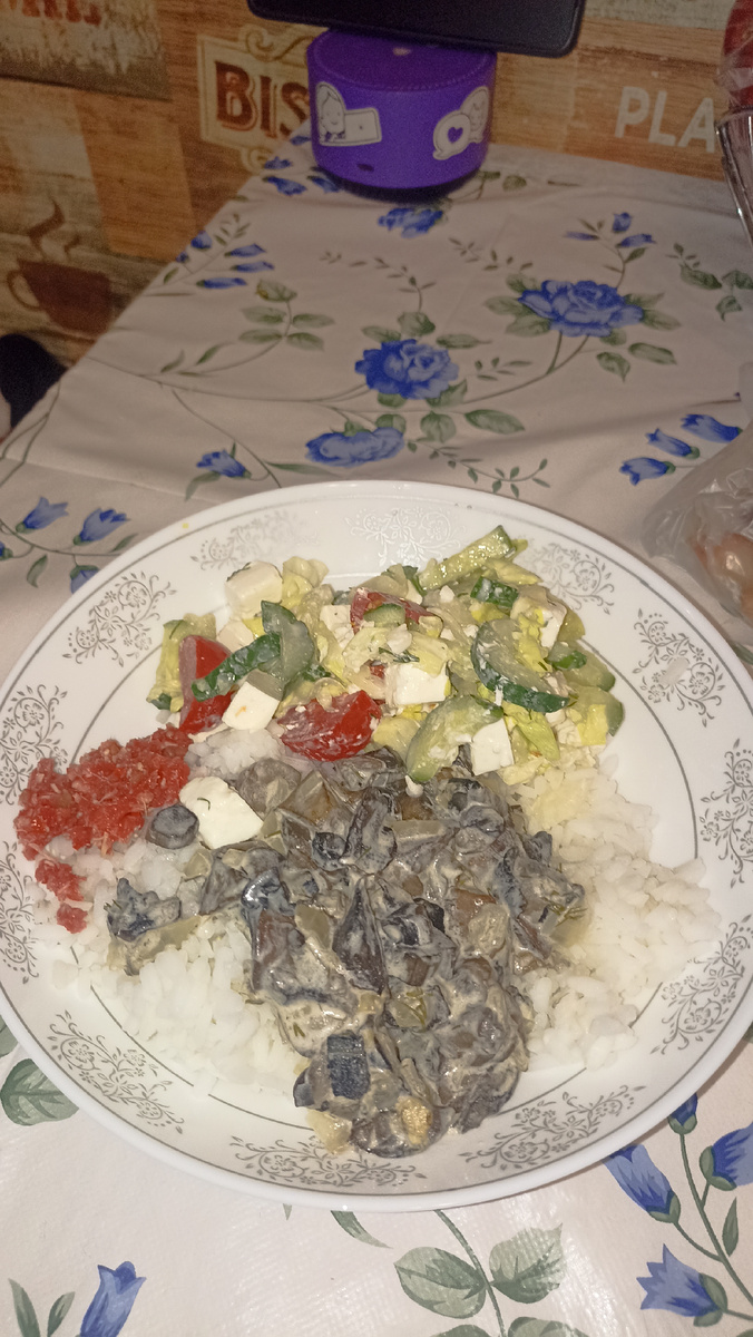 Доброго времени суток! Не успеваю я четко писать ответы, так что уж как получится. Вчера был пятый день эксперимента. На продукты не потратили ничего. Всё так же остаток 2962 рубля. У плиты вчера стоял муж. Ну как стоял? Грибы пожарил с луком и сметаной. Днём ему тоже было не до чего. Ездил утром с детьми на выписку старшего сына. Время перепутал и ждать пришлось больше часа. Потом на выписку младшего. Питались тем, что в холодильнике. Бутерброды с сыром, рис с курицей. А это моя тарелища, когда вернулась с работы. Потом ездили покупать матрас. В "Асконе" средняя цена на тот, который нам нужен 40000 рублей 🤦♀️ Поехали в другое место. Нашли похожий за 20 т.р. На заказ. Примерно 1,5 месяца ждать. Долго, но начало положено. За футбол заплатили 9600 за двоих. Тренер сделал перерасчёт. Ну и на форму перевели 5600 р. Так деньги и улетают - не на еду, так на что-то другое. Из морозилки достали кусок свинины размораживаться. Муж что-нибудь приготовит) На этом заканчиваю. Дел по горло! Всем