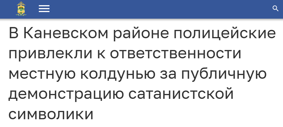 Суд назначил штраф 32-летней жительнице станицы Стародеревянковской Краснодарского края за публичную демонстрацию сатанинской символики (20.3 КоАП). Об этом сообщили в пресс-службе регионального МВД. В ведомстве отметили, что женщина «позиционирует себя как ведьма и колдунья», а также назвали ее «чернокнижницей». Протокол на жительницу кубанской станицы составили из-за того, что она, по словам полицейских, опубликовала у себя в соцсетях «символику экстремистского международного движения». При обыске дома у «колдуньи» обнаружили «ритуальную атрибутику» В МВД не уточнили, какой суд оштрафовал женщину и на какую сумму. Ее имя силовики также не сообщили. «Медиазона» обнаружила, что 2 ноября в Каневской районный суд Краснодарского края поступили два протокола о демонстрации экстремистской символики на Инну Май. Женщина с таким именем называет себя на персональном сайте практикующей ведьмой. Сейчас ее страницы в социальных сетях закрыты. Верховный суд РФ 23 июля признал несуществующее «между