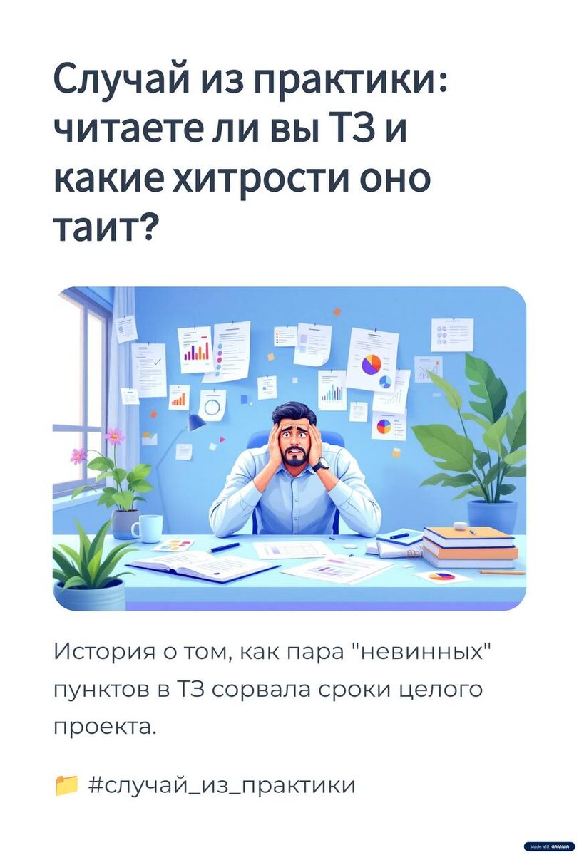 Случай из практики. Читаете ли вы ТЗ, и какие хитрости оно таит? Через неделю выдаем стадию П, наконец-то все вопросы с продуктом закрыты, наработки по инженерным решениям уже есть и вроде ничего не мешает «сделать рывок», о котором так сильно просит Заказчик. Вдруг разработчик раздела ЭОМ пишет, что не хватает большого количества исходных данных: не выбрана мобильная снегоплавильная установка, не выдано задание на подключение зарядок для электромобилей в паркинге, не выдано задание на подключение лючков в благоустройстве для подключение потребителей для проведения праздничных мероприятий, отсутствует задание на зарядки для телефонов и обогрев скамеек, не выдано задание на обогрев мощения входных групп. ❓Как же так получилось Все дело в том, что Заказчик включил в ТЗ несколько дополнительных задач ✅ Первый тип задач подразумевал, что подключение лючков на благоустройстве, зарядку для телефонов и обогрев скамеек выполнить согласно концепции благоустройства. ❌ К сожалению, концепция
